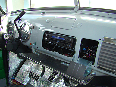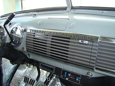 The AcoustiTRUCK will be on the road and to make the interior comfortable, we wanted airconditioning. Uncontrolled heat in older cars is always an issue, and factory air conditioning for a truck in 1953 was unheard of. Old Air Products of Fortworth, Texas offered the custom solution with an under-dash unit that is formed to fit the bottom lip of the dash--it looks “factory.”