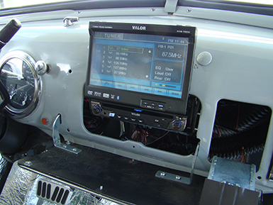 The AcoustiTruck has all of the twenty-first century bells and whistles including a 7” Valor Multimedia Center with navigation, bluetooth, AM/FM/CD a/DVD and rear view camera—all hidden away under the stock dash facia. We installed a set of glove box hinges on both ends of the center dash grill that folds down to reveal the Valor system. Once the dash grill is lowered, the Valor screen slides out into a full upright position for easy viewing.