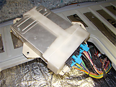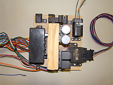To make things compact under the drivers seat, we mounted the fuse block, relays and miscelanous compter relays and sensors to a wood base with enough slack in the wire harness umbelical to allow it to slide out for service.