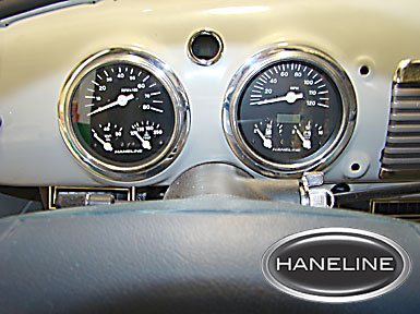 Haneline’s new Three-N-One Elelctric dash instruments were the perfect choice to replace the stock GMC mechanical gauges. The new gauges include the Speedo, Fuel and Volt in one set five-inch and Tach, Temperaguwe and Oil in the other cluster. The three-N-One gauges were desiged for custom applicaations with a 120 MPH speedo, LCD odometer, fuel and volt plus matching tach with oil, and temperature for custom installaltion. The gauges offer a clean design, flexibility and state-of-the-art mechanics. The two-gauge set included all the sending units, trim rings and brackets and the installation was straight forward and simple. The Haneline gauges have their own wire harness that we pluged into the main body harness. We needed a transmision indicator and found the perfect fit with a Dakota Digital transmission gear indicator that also included turnsignals. Installation was easy lwtih its onw harness and sending unit.has its own harness.