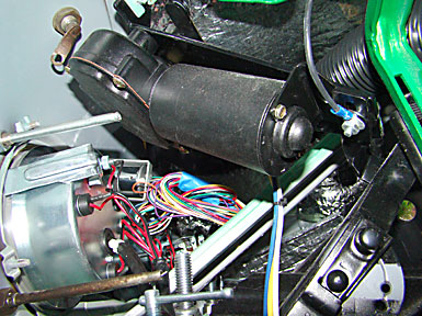 The fuse block and related electronics were mounted in the new seat pan under the driver’s seat to reduce the “rats nest” under the dash. Of the 60 some wires that leave the fuse block, only those that were needed for the gauges, steering column and the Old Air Products Hurrican airconditioning unit and accessories were brought up behind the firewall insulator. The rest of the wiring goes back to the tail lights and fuel tank, the engine or the headlights.