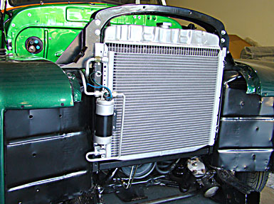 The condenser assembly includes an aluminum “Super Kool Condenser” receiver/drier, mounting brackets and custom tubes for either driver or passenger side mounted compresor. We adding the optional trinary switch upgrade and additional 14” electric condenser fan to increase airflow across condenser to maximize the A/C system performance.