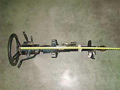 The steering column was one of the parts saved from the Caprice. We wanted a GM column and it was in great shape except for the funkey steering wheel--we found a good replacement 1993 wheel at the Delta Auto Wrecking yard. The steering column went in after the insulator was installed because it partially rests on the bottom edge of the insulator. The S-10 steering column and brake turned out to be a simple solution. The lenght of the S-10 firewall to dash support bracket is a perfect fit in the 1953 dash. We had to do a little bending and cutting on the end of the bracket to make way for the diameter of the Caprice column. To make the steering column match up to the S-10 bracket, we had to move the upper mounting “T” bracket by grinding the welds off. We used one inch stand-offs between the steering colum “T” and the lower edge of the dash. For the brake pedal, we use a stock swing pedal from a 1986 Chevy half-ton truck.