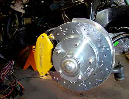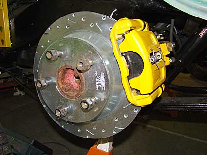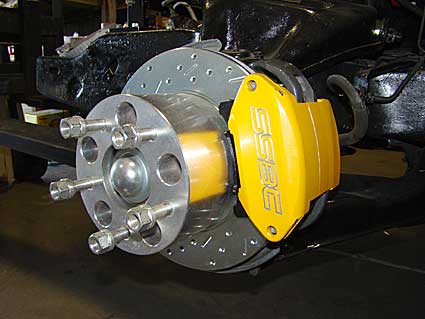The GM factory brakes on the Chev S-10 were descent for a small truck, but “wanting” for the additional mass of the the Panel Truck body. The front had 10-inch discs and the rear had drums. We turned to Michael Jonas, president of Stainless Steel Brake Company, the leader in the development of disc brake technology. His recommendation was to upgrade the rear to a disc brake system to match the front. We decided on the SSBC Sport-Twin “quick change” aluminum calipers. We also deciced on SSBC’s new cross-drilled and sloted “Big Bite rotors which feature cooler operating temperatures ensuring maximum friction between pad and rotor for maximum stopping power and durability; improved braking in wet weather driving and, quieter operation. The combination of dual-piston calipers and Big Bite rotors gives the AcoustiTRUCK the stopping power of a C-5 Corvette.
