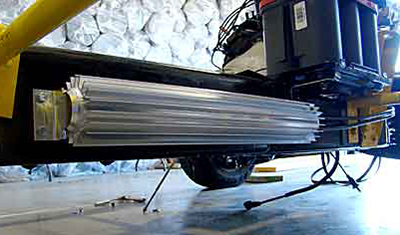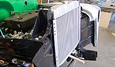 In addition to the transmission cooling built into the lower part of the radiator, the Caprice came with a transmission cooler that was hung under the front bumper as part of the Police Package upgrade. The new Griffin Radiator from Old Air Products has a transmission cooler built into the bottom and we added an after market dual flow cooler to the passenger side rail of the chassis. Fluid is plumbed in line so that it flows in a complete circle--from the transmission to the radiator; then out to the auxillary cooler and then back into the transmission.