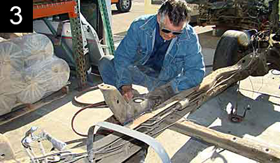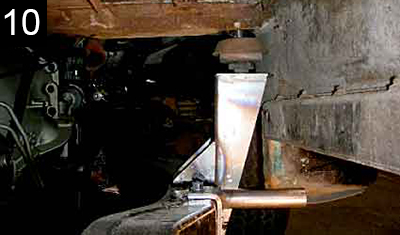 The AD-Engineering conversion kit comes with pre-fabricated engine mounting plates that will accomodate a variety of engine choices including the original six-banger. After we were sure of the engine mount alignment, we welded the plates and stands into positon (9). A close up view of a body mount bracket in place. The bracket in the foreground holds the running board framing in position. There are three brackets for each side holding the running board support structure in the proper location (10).