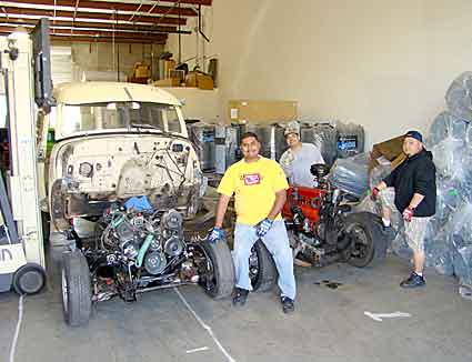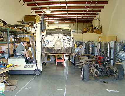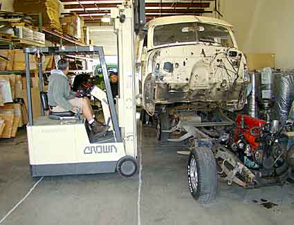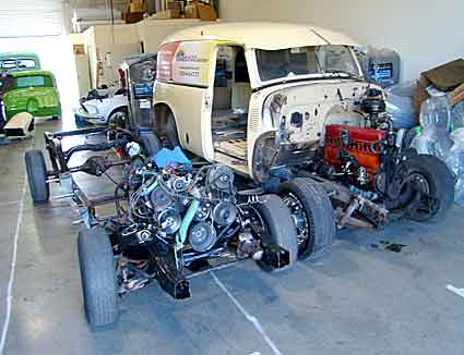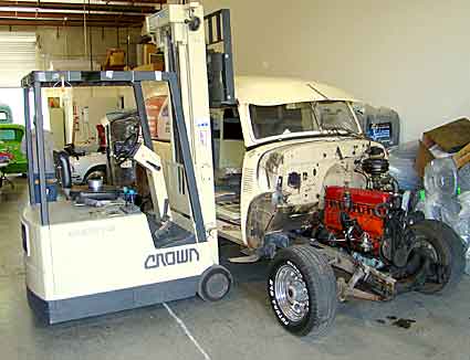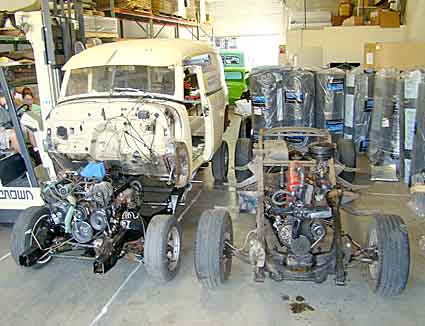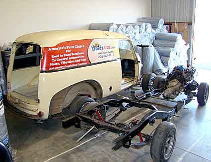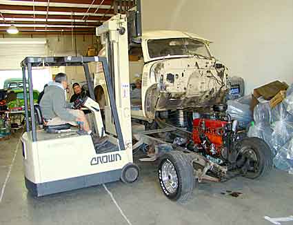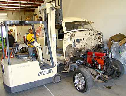 The stage is set for the transition. The body is lifted off the old 1953 chassis onto the new 1988 Chevy S-10 Chassis in 10 minutes. The new S-10 chassis sits waiting for the Panel Truck body to be moved over. In this series of photos you can see the process of lifing the panel truck body from its original 1953 chassis to the new Chevy S-10 chassis.