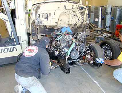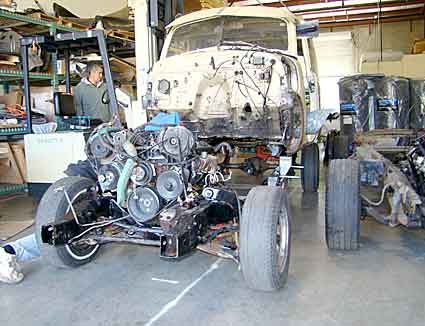 1953 GMC Chassis (1). The Mechanical Rebuilding of a 1953 GMC Panel Truck (2). S-10 Body mounts are removed to prepare the chassis for new body mounts, manufactured by AD-Engineering (3). With the body mounts installed on the S-10 chassis and the engine in its approximate position, we lowered the 1953 half-ton Chevrolet display cab onto the front body mounts so that we could adjust the engine location. We wanted at least a full inch of clearance between the firewall and rear of the engine heads and distributor for maximum air flow and heat dissipation (4).